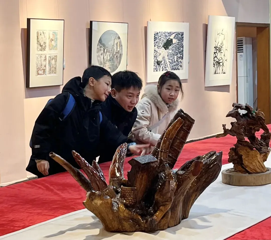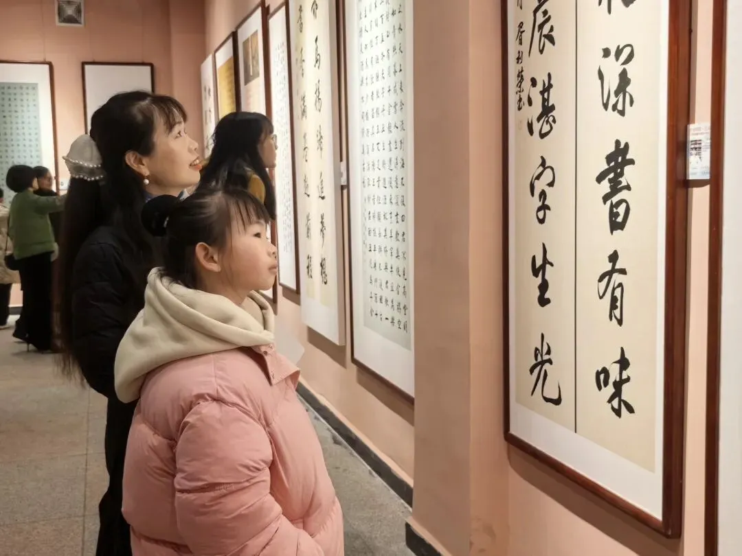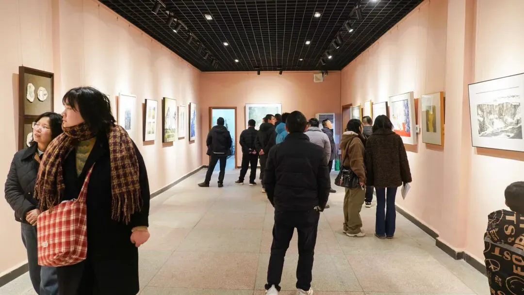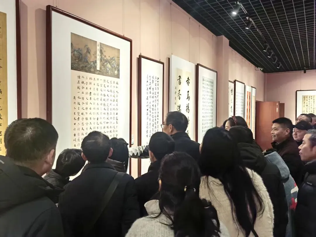 开幕式结束后,嘉宾与观众们有序步入展厅观展。展厅内,笔墨飘香、佳作林立,103件入选作品涵盖国画、油画、水彩、板绘、书法、雕塑、非遗等多个门类,风格各异、意蕴深远。山水作品勾勒洞庭烟波浩渺之态,书法作品尽显笔墨流转之韵,非遗与民俗题材作品传递本土文化温度,每一幅作品都凝聚着创作者对生活的感悟、对家乡的深情与对新年的期盼。参观者驻足凝视、轻声交流,沉浸式感受艺术与文化的双重熏陶。