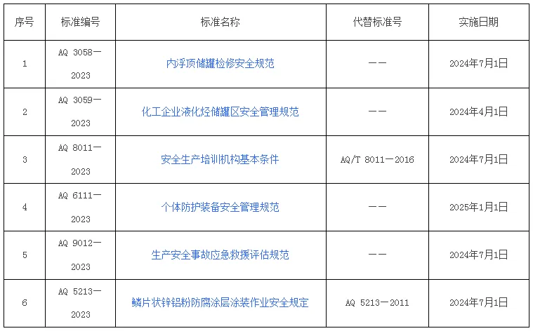 6项安全生产行业标准目录