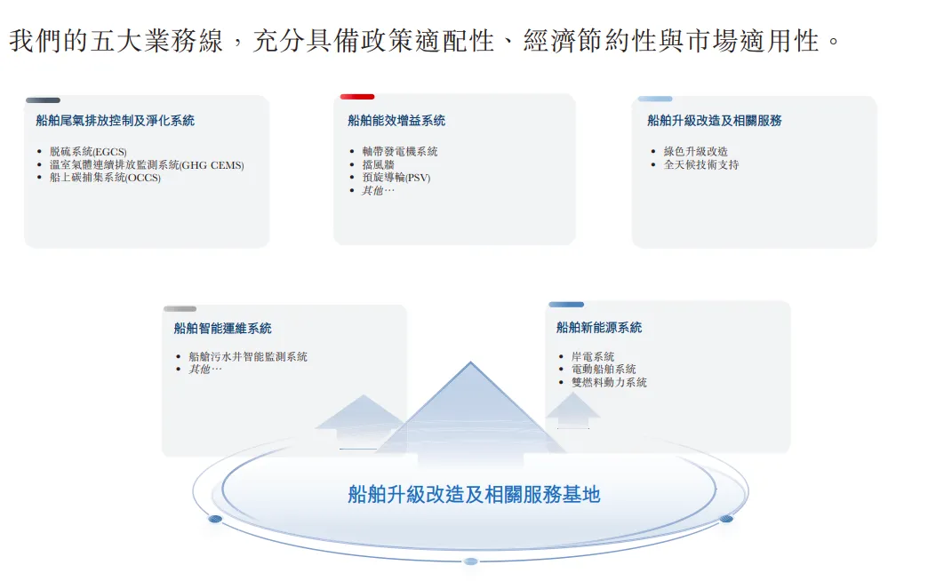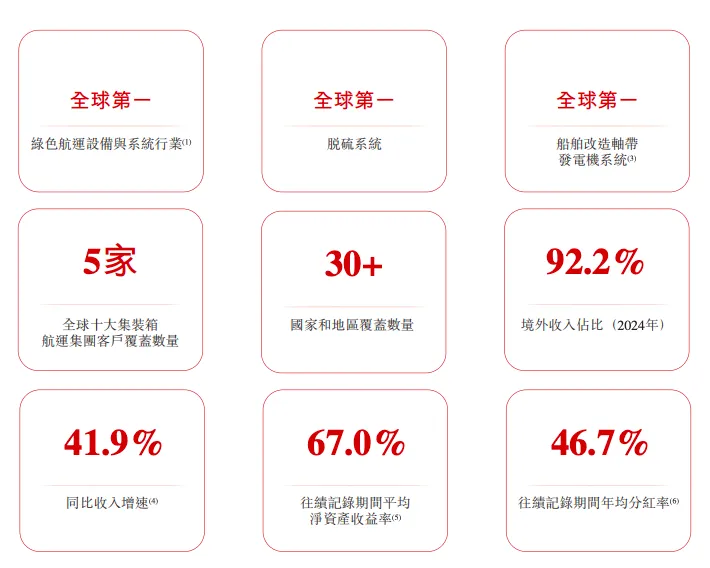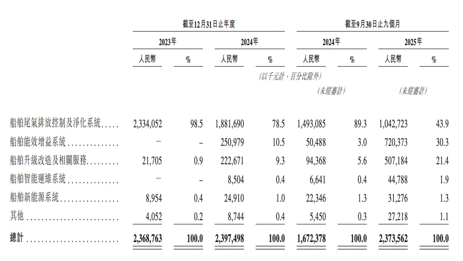 根据灼识咨询的数据,按2024年及截至2025年9月30日止九个月的收入计,公司是全球第一大绿色航运设备和系统提供商,同时也是全球最大的船舶尾气排放控制及净化系统供应商;按截至2025年9月30日止九个月的收入计算,公司更是全球最大的船舶改装能效增益系统提供商。
