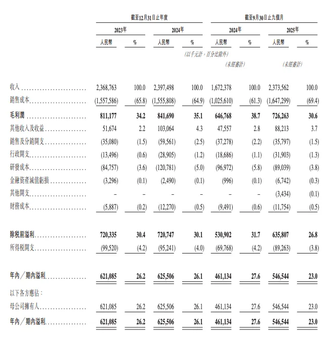 公司收入由2023年的人民币23.7亿元轻微增加至2024年的人民币24.0亿元,并由截至2024年9月30日止九个月的人民币16.7亿元大幅增长41.9%至2025年同期的人民币23.7亿元。盈利上,2023年、2024年及截至2025年9月30日止九个月,公司的股本回报率分别为97.8%、61.6%及41.5%;同期年内/期内溢利分别为人民币6.21亿元、6.26亿元及5.47亿元,盈利能力稳定。