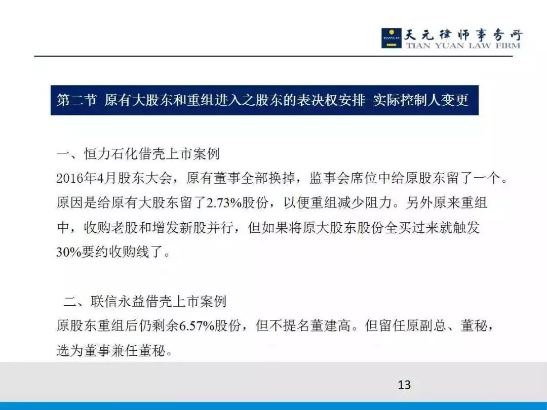 第一,《上市公司重大资产重组管理办法》第13条规定控制权发生变更,如果能够论证说上市公司控制权没有发生变更,那就有可能不构成借壳上市了。比如上面分享的[XXX]2014年重大资产重组案例。