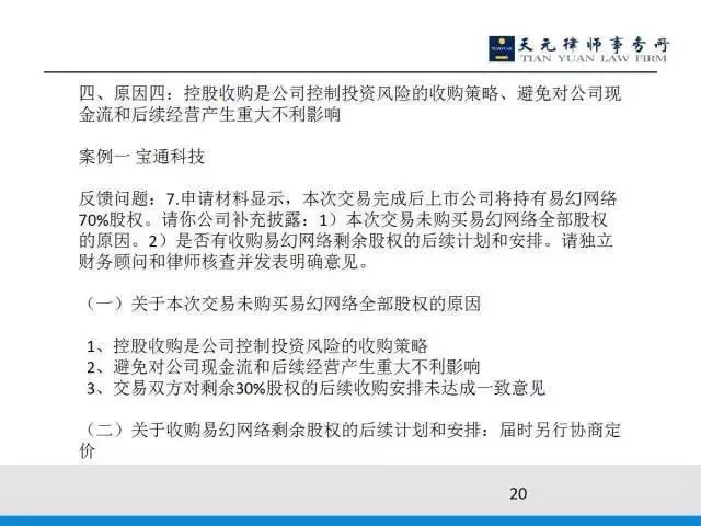 宝通科技的反馈意见中证监会也是问到:为什么没有100%收购,另外对于少数股权是否有未来的收购计划?上市公司的答复是:我们没有收购100%是为了控制投资风险,另外要避免对公司现金流和后续经营产生重大不利影响;对于30%的股权,目前我们与标的资产少数股东未达成一致意见。