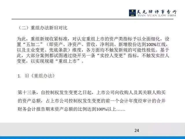 原来的借壳上市,规定是实际控制人发生变更,且资产规模达到100%,就构成借壳上市。现在重组新规收紧了标准,对认定重组上市设了一个“五加二”的线。