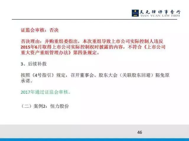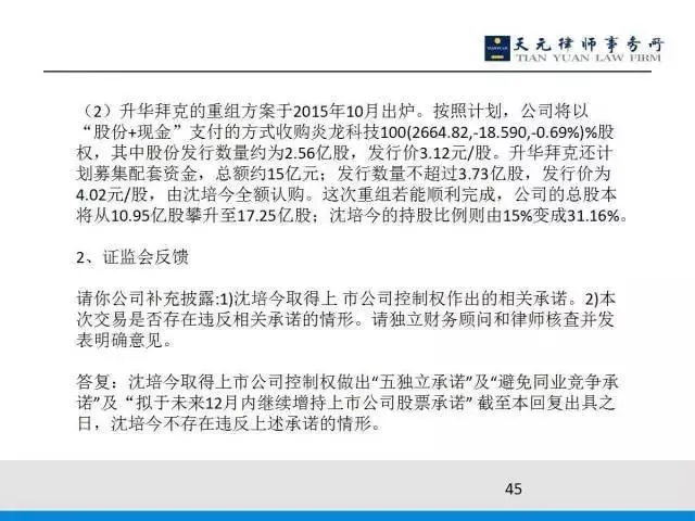 按照上交所的要求,第一,中小股东在股东大会的表决。中小股东认为你不违反就不违反,并且在开股东大会前夕原有的实际控制人承诺:只要中小股东认为我违反我就终止重组。