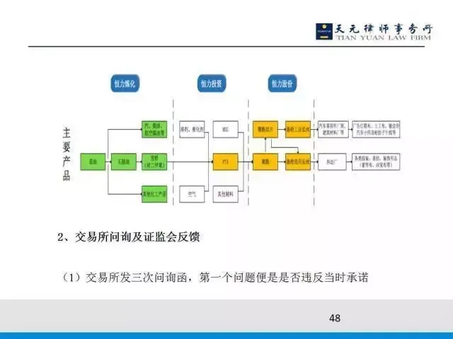 这个案例怎么通过的呢?首先看下标的企业是怎样的产业链条。实际控制人叫陈建华和范红卫,原先是做纺织厂,发现他的上游原材料被人控制,就业务向上游拓展,去做长丝,所以他做了原来叫吴江纺织厂的上游拓展,江苏恒力化纤置入资产是做这个涤纶长丝的。此后他发现涤纶长丝的上游也是有利可图的,然后又往上拓展PTA。