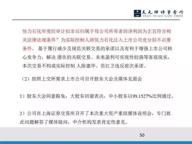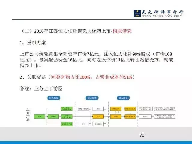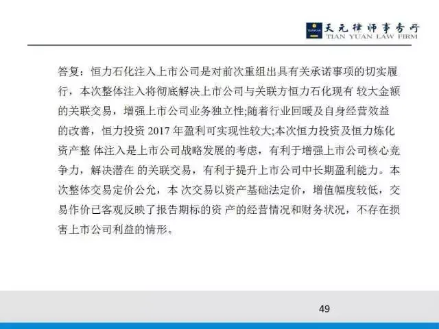 另外从恒力石化角度看,我卖给上市公司的只占25%,剩下的75%卖给非关联方的,并且价格基本持平,从这个角度来论证两者是互不依赖,并且价格由大宗交易市场指导。所以这个案例过会了,并且满足两个标准,一个是IPO的标准,因为它是借壳上市,另外满足了上市的重组标准。