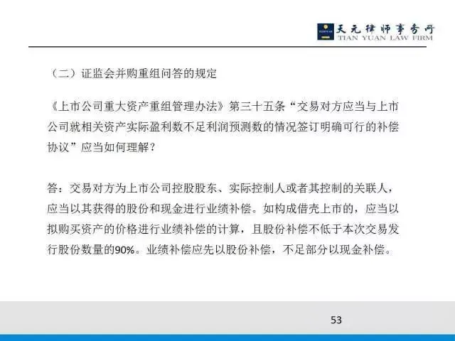 后面追了一条是说如果市场化的并购你可以不做业绩对赌,对于股份补偿、现金补偿的硬性规定,问答里表述为,如果是你是向大股东来发行股份,那么构成借壳的话要以股份来补偿,股份补偿比例不低于90%,然后不够的部分采用现金补偿,所以总体来看的话就是除了法定补偿以外的话,就是市场化并购是由市场主体来约定的。