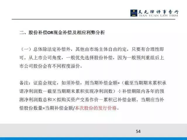 为什么从证监会的角度它会主推股份补偿?因为证监会规定,股份补偿的数量是当期补偿金额/本次发行股份的发行价格,因为重组一般做完后上市公司的股价会飙升。飙升的情况之下的话,如果按照这个飙升以后的股价来补的话,那收购人实际上来讲股份数量少,但是如果按照当时的发行价格的话就意味着收购人损失更大,所以证监会比较喜欢股份补偿。