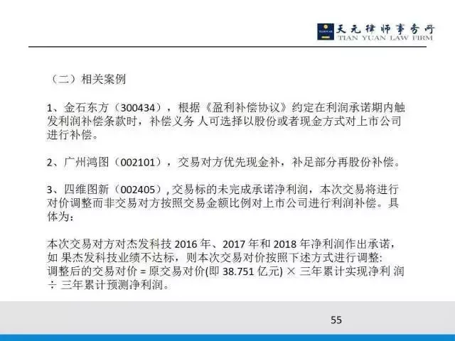 此案比较有意思,它直接调收购价格,如果业绩承诺没有完成,你直接把收购价格调过来意味着什么呢?就是原交易对价×三年累计实现净利润÷三年累计预测净利润。