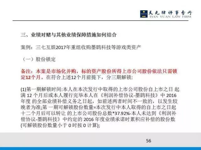 三七互娱在17年做过一个重组,收购的是游戏类资产。大家可能也知道游戏公司是轻资产公司,游戏类资产标的公司的核心资源是人,所以它的业绩对赌主要是围绕着人来做的,业绩保障措施主要是围绕锁定人来实现的。