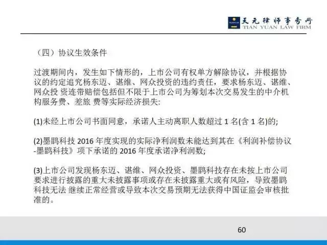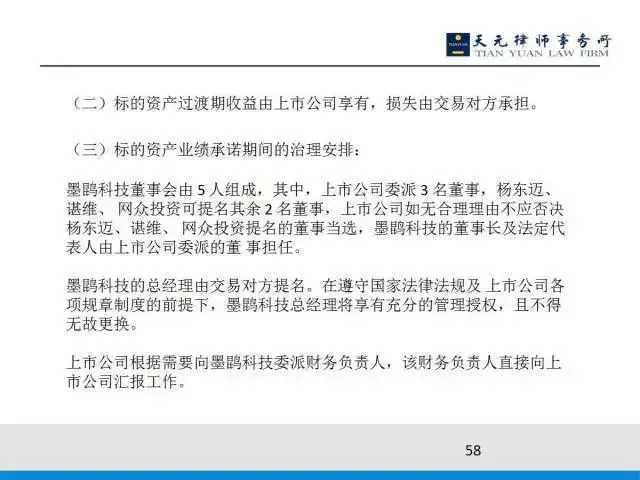 第三,控制权的治理安排。标的公司的董事会由五人组成,上市公司派三名,杨东迈等人提名两名;总经理由交易对方来提名,并且享有充分的管理授权,且不得无故更换;但上市公司要派财务,该财务负责人直接向上市公司汇报工作。