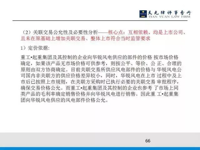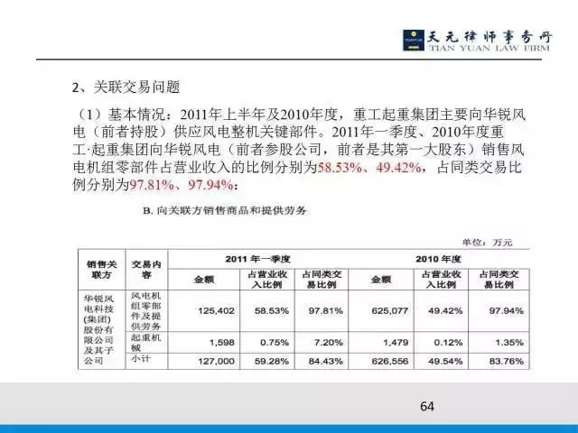 中间一个关联交易问题是这个交易完成以后,我这个上市公司就是拿来了集团的经营资产,以后我与华锐风电的关联交易占比很大,大到什么地步呢?就是说在营业收入的比重达到58%和49%,最近一期占到整个上市公司营业收入的58%,也就是达到将近60%了,占同类交易的比例是97%,就是对于这个核心零部件,因为我卖给华锐风电的零部件,整个占销售的97%,然后业务占我整个营业收入的比重达到49%,这个占比是非常惊人的。
