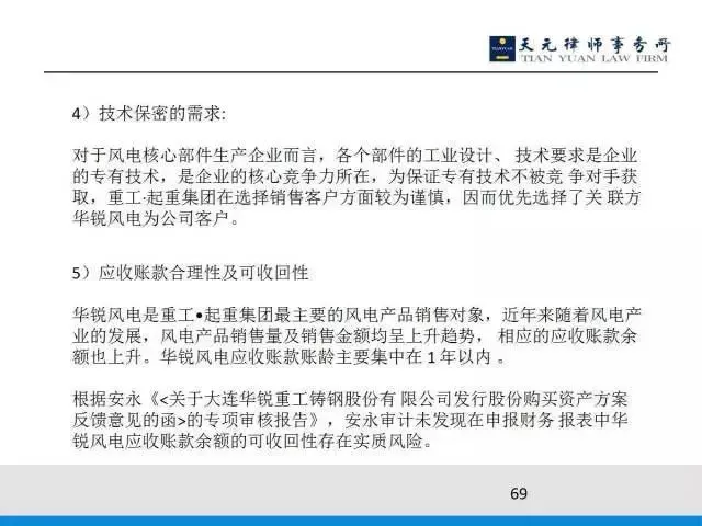 此外,应收账款也不少,伴随着重工起重集团不断地卖给华锐风电90%的零部件,50%的营业收入都是由华锐风电来创造的,应收帐款比较多。上一年是40个亿,至报告期期末是42个亿。这个关联交易怎么分析呢?我们当时通过几个点来分析,第一是互相依赖,第二均为上市公司,第三未在原基础上增加关联交易、整体上市符合当时监管要求。