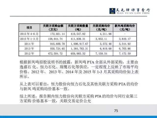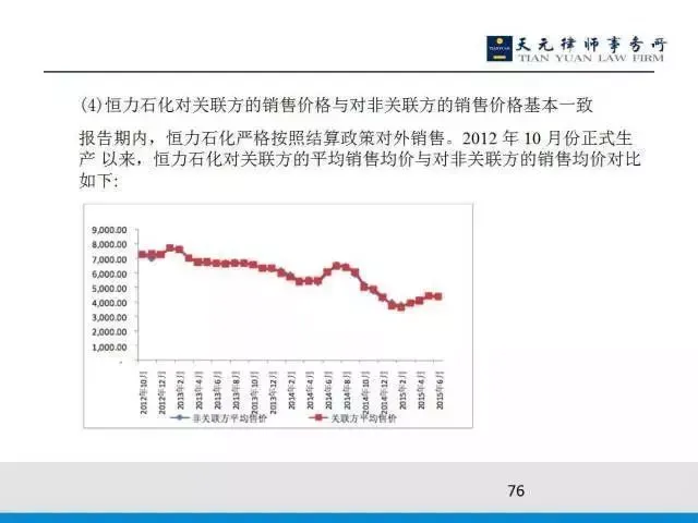 最近一期恒力化纤跟他的均价每吨差了不到20块钱,所以给证监会看恒力化纤跟市场上的可比第三方价格基本是一样的。另外,我们要分析恒力石化卖给非关联方的价格与卖给这个上市公司的价格是基本持平了,恒力石化生产PTA只有25%是卖给上市公司,剩下的75%卖给非关联方。