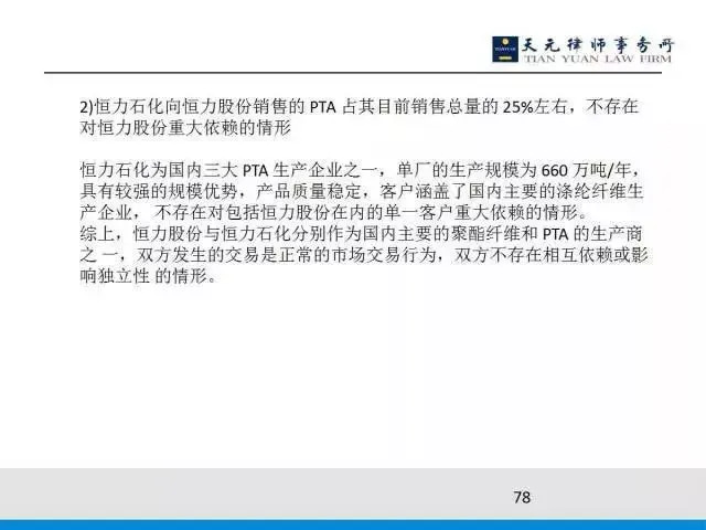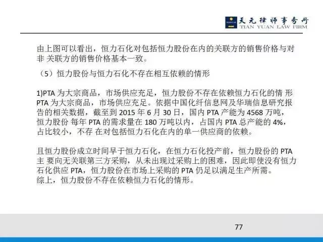 卖给非关联方的价格与卖给关联方的价格基本是一样的,此外我们要论证说不存在依赖,为什么呢?PTA是市场上的大宗商品,市场供应价格适合,市场供应充足,而这个上市公司只用整个国内PTA产能的4%,剩下的96%有充足的公共渠道。