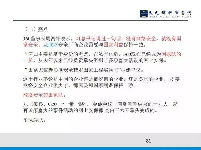 按照证监会的要求,360的实际控制人在上交所召开了媒体见面会,周鸿祎表示习总书记讲过:没有网络安全,就没有国家安全,而360就是网络安全最重要的社会参与力量,与国家利益保持一致。这些话不单是讲给媒体的。