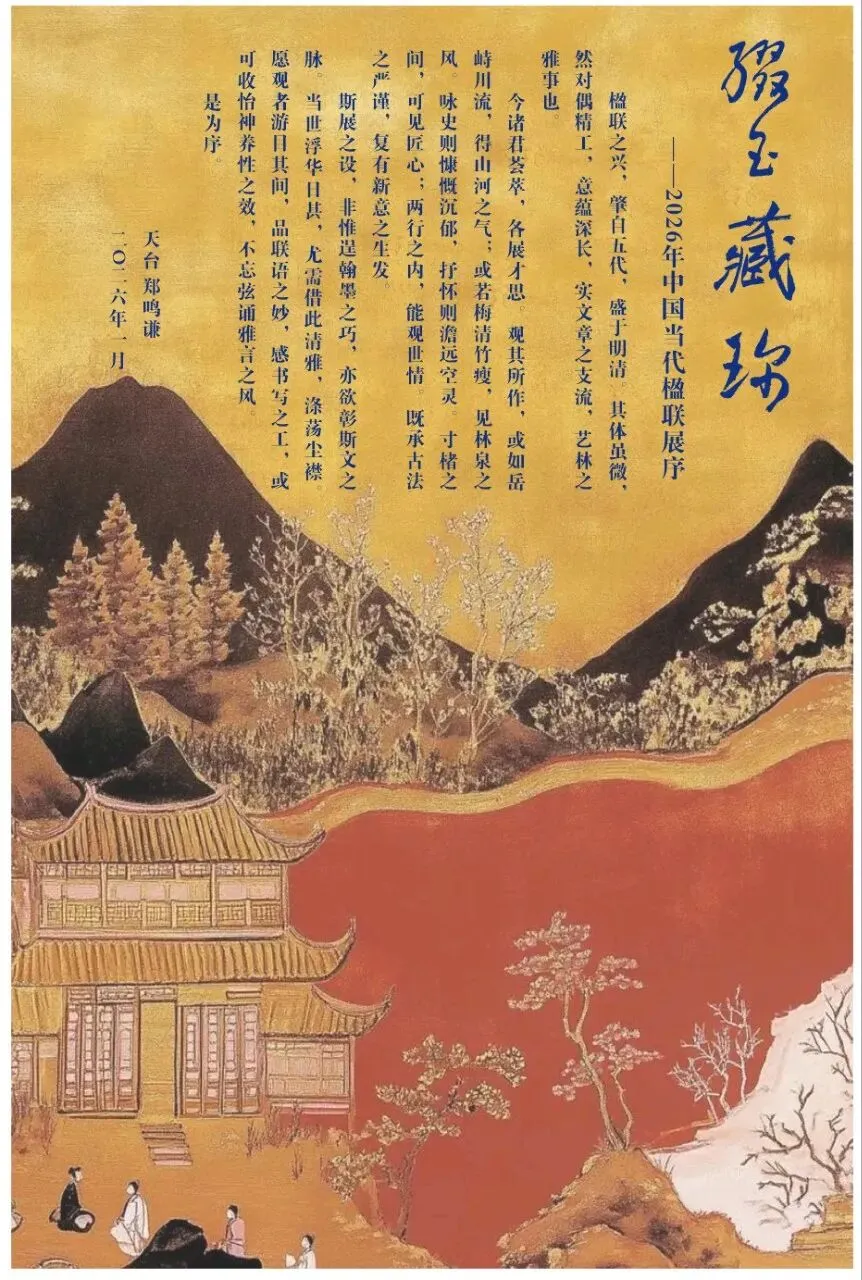 1月31日,“缀玉藏珍——2026年中国当代楹联展”在浙江省天台县南屏乡南山美术馆正式开幕。本次展览汇集了近百幅楹联书法精品,为当地民众带来了一场融合传统艺术与新春气息的文化活动,吸引了约200名观众到场。