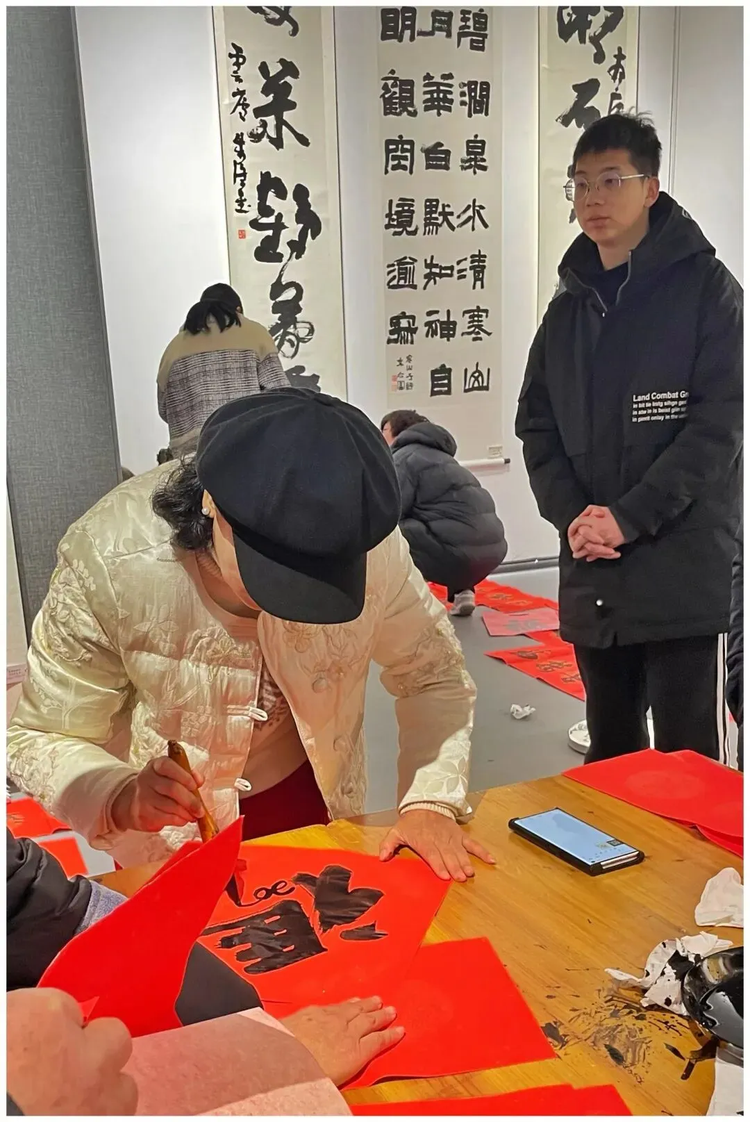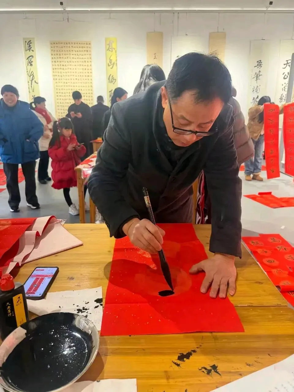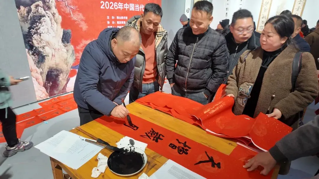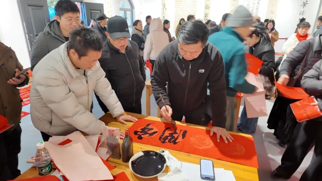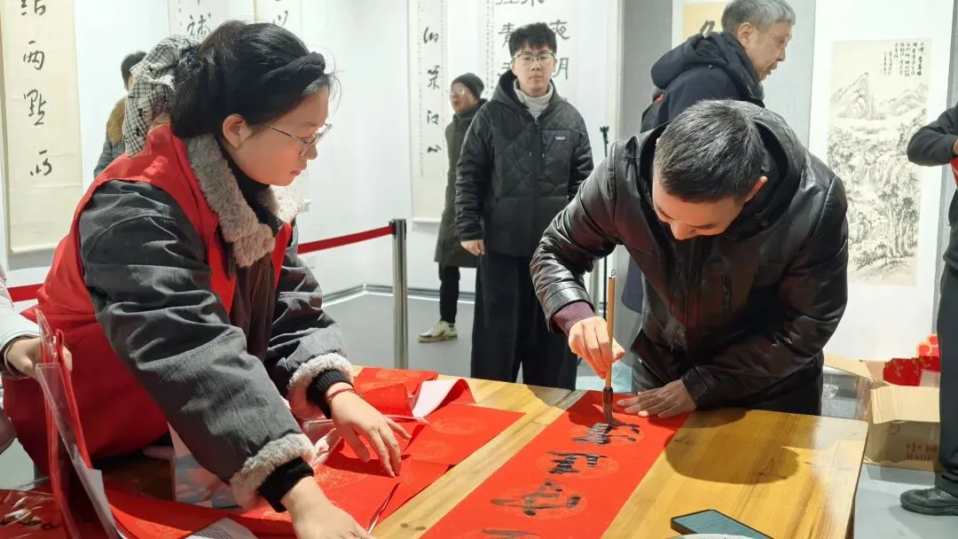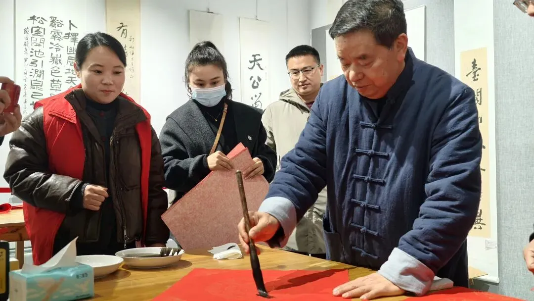 开幕式后,现场举行了“迎春送福”书法惠民活动。娄依兴、杨廉素、孙新龙、郑鸣谦、陈红松、陈万淮、许式兵、杨卫强、庞慧芳等多位书法家挥毫书写春联与“福”字,赠予前来参观的群众,传递新春祝福。