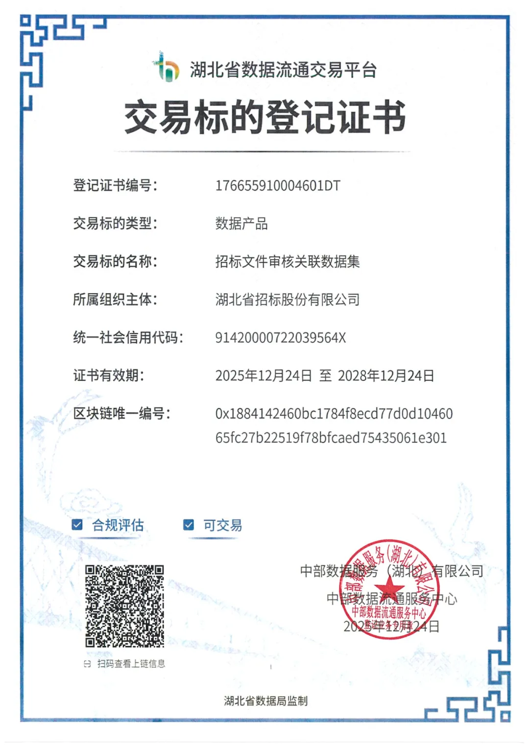近日,湖北省招标股份有限公司(以下简称“省招标公司”)研发的“招标文件审核关联数据集”数据产品,顺利通过湖北省数据产权登记平台审核,取得《数据产权登记证书》《数据资产登记证书》及《交易标的登记证书》等5项权威认证,并上架湖北省数据流通交易平台。此举标志着湖北省招标采购领域首例数据资产入表工作正式完成,为全国招采领域数据资产化实践树立新标杆。