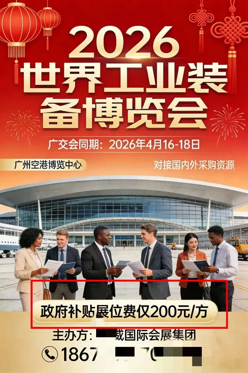 突然收到广州某威会展公司某销售(群)发来的“2026世界工业装备博览会”招展海报,我留意到里面有提到“政府补贴展位费”的问题。