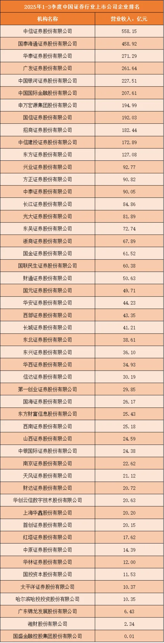 根据申万行业分类,2025年1-3季度中国证券行业上市公司按营业收入排名如下:(A股上市公司)