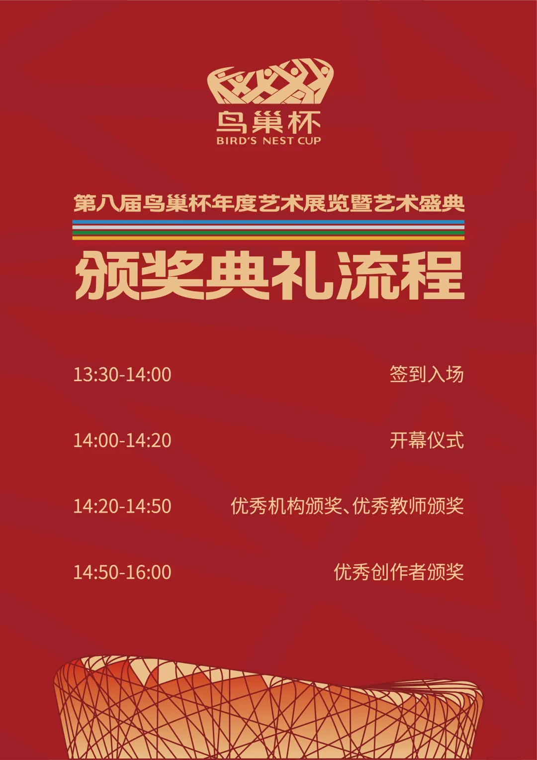 第八届“鸟巢杯”年度艺术盛典颁奖典礼,将于2026年2月7日(周六)14:00在国家体育场(鸟巢)·金色大厅举办,具体安排如下: