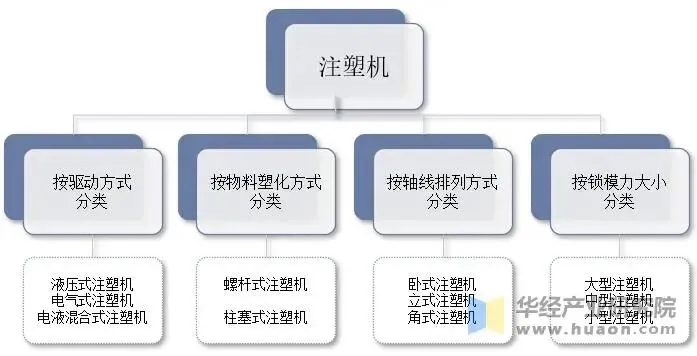 注塑机又叫注射成型机或者注射机,是注射成型的主要设备,其功能是将热塑性塑料从粒状原料转变成最后的成型品,并在每一步中完成溶融、注射、保压及冷却一个循环。根据驱动方式的不同,可以分为液压式注塑机、电气式注塑机和电液混合式注塑机;根据物料塑化方式的差异可以分为螺杆式注塑机和柱塞式注塑机,螺杆式注塑机的混炼性以及余塑化原料质量要优于柱塞式注塑机;根据注射与合模装置轴线方向的不同,可以分为卧式注塑机、立式注塑机和角式注塑机;根据锁模力大小的不同可以分为大型注塑机、中型注塑机和小型注塑机,锁模力分界线分别为5000kN和1000kN,中小型注塑机占据主要的市场份额。