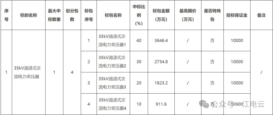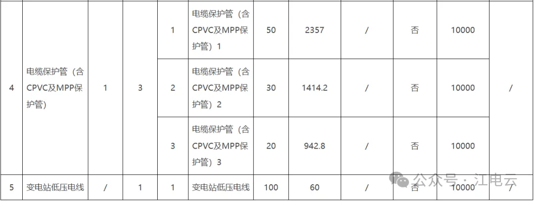 2.1项目概述:本次框架招标采购的物资为35kV油浸式交流电力变压器、10kV户外跌落式熔断器、10kV柱上隔离开关、电缆保护管(含CPVC及MPP保护管)、变电站低压电线,按预测量划分标的标包,合计5个标的,19个标包。
