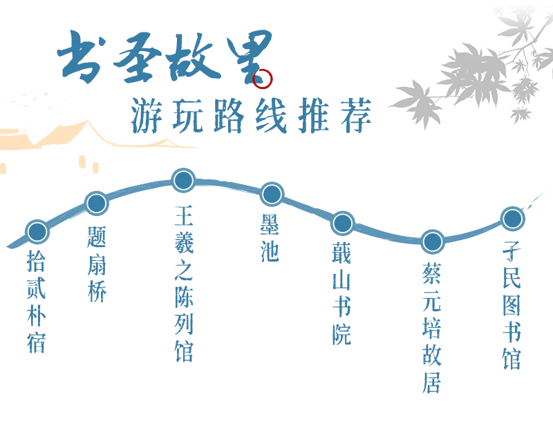 游玩路线:民宿出发→题扇桥→王羲之陈列馆→墨池→蕺山书院→蔡元培故居→孑民图书馆