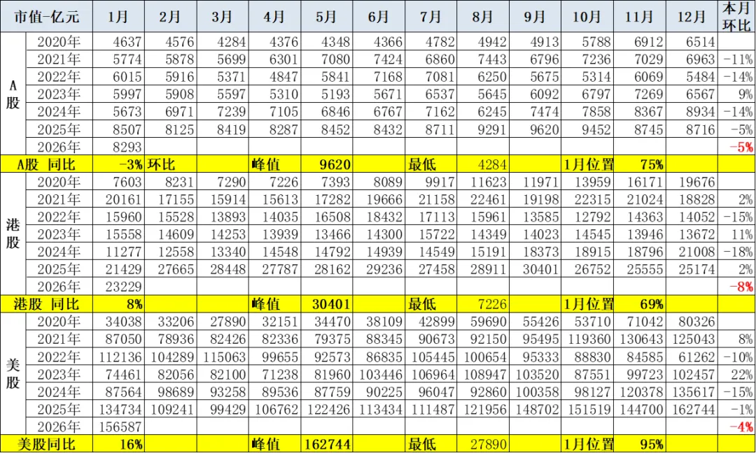 世界汽车整车企业市值中,美股市场的规模最大,2026年1月份达到15.66万亿元的规模,环比12月降4%,同比2025年1月增16%;而港股市场也达到了2.32万亿元的规模,环比12月降8%,同比增8%;国内A股市场达到8293亿元的规模,环比12月降5%,同比降3%。
