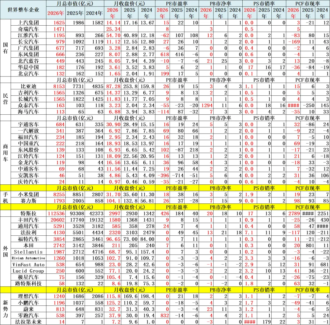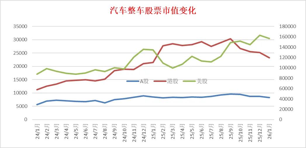 汽车整车类上市公司主要是在美国股票市场和香港股票市场,以及国内A股市场三大市场进行研究。欧洲市场由于相对比较分散,暂时不做研究。世界汽车整车企业市值中,美股市场的规模最大,2026年1月份达到15.66万亿元的规模,环比12月降4%,同比2025年1月增16%;而港股市场也达到了2.32万亿元的规模,环比12月降8%,同比增8%;国内A股市场达到8293亿元的规模,环比12月降5%,同比降3%。在这里我们把A股港股中有些多地上市的公司市值会按第一上市地做侧重。针对比亚迪汽车、吉利汽车、长城汽车统一放到港股中,这样A股相对来说比较传统简单一点。
