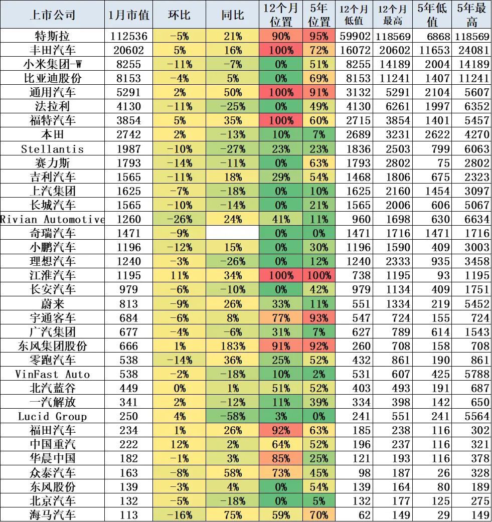 1月汽车整车企业市值变化相对较大,特斯拉较顽强。1月份相对于12月份表现较强的是日本车企,其它二线车企的市值提升主要是商用车的增长效果。