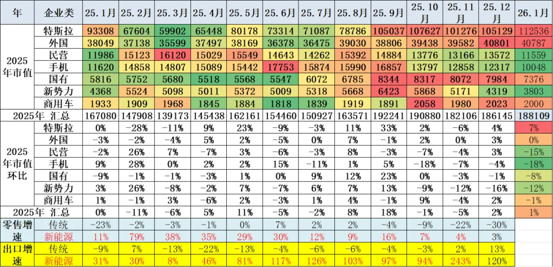 1月内销车企表现相对压力较大,出口是新能源车的核心增长,出口强的企业表现好一些。