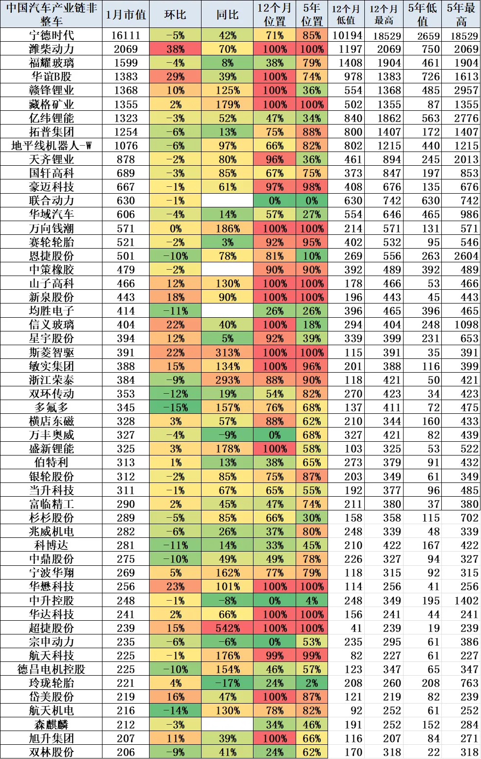 汽车产业链上市公司的情况比较复杂,零部件类相对较好,电池类分化,矿业类暴涨,经销商集团压力较大。