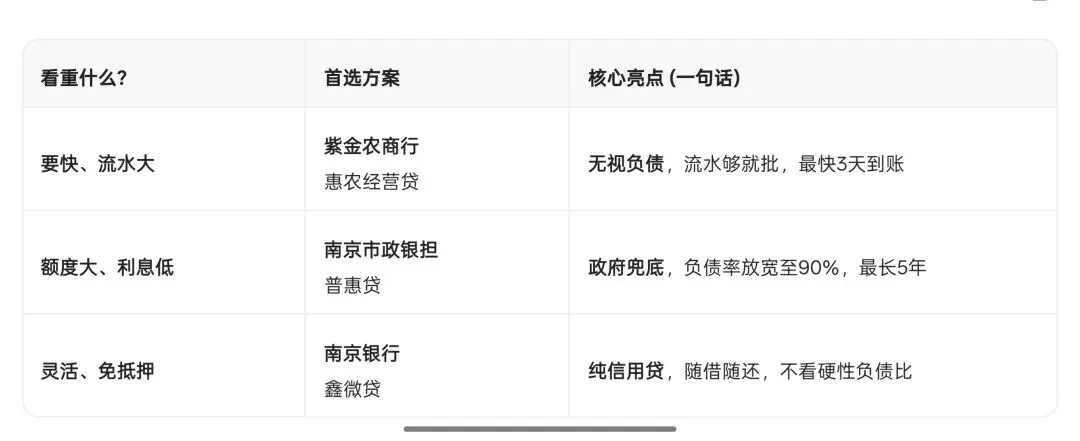1,精准匹配产品:纳税稳定选南京银行鑫微贷,流水充足选紫金农商银行惠农经营贷,需要低息长期资金选政银担普惠贷,避免盲目申请增加征信查询。