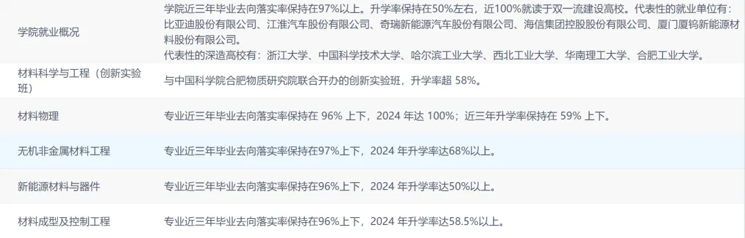 合肥校区:材料科学与工程(创新实验班)、材料科学与工程、材料物理、无机非金属材料工程、电子信息材料专业 宣城校区:材料成型及控制工程、新能源材料与器件专业 升学与就业: