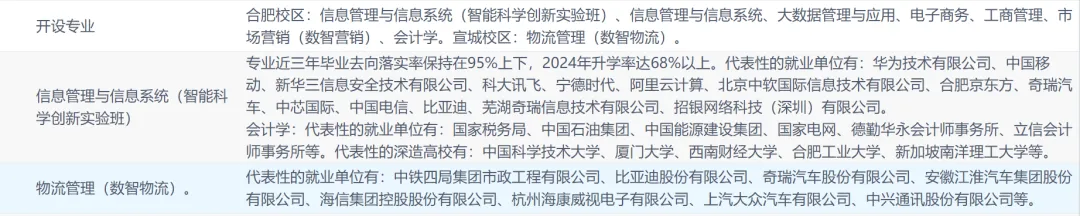 合肥校区:信息管理与信息系统(智能科学创新实验班)、信息管理与信息系统、大数据管理与应用、电子商务、工商管理、市场营销(数智营销)、会计学 宣城校区:物流管理(数智物流) 升学与就业: