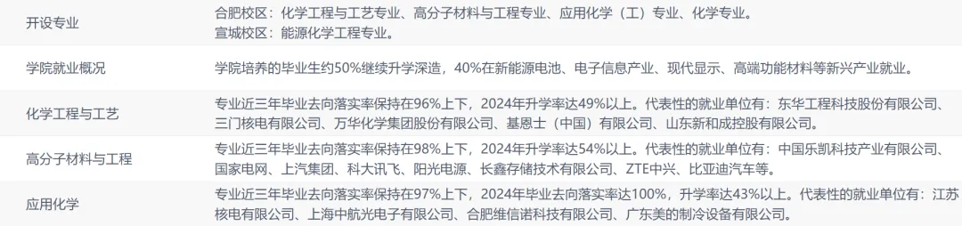 合肥校区:化学工程与工艺、高分子材料与工程、应用化学(工)、化学 宣城校区:能源化学工程 升学与就业: