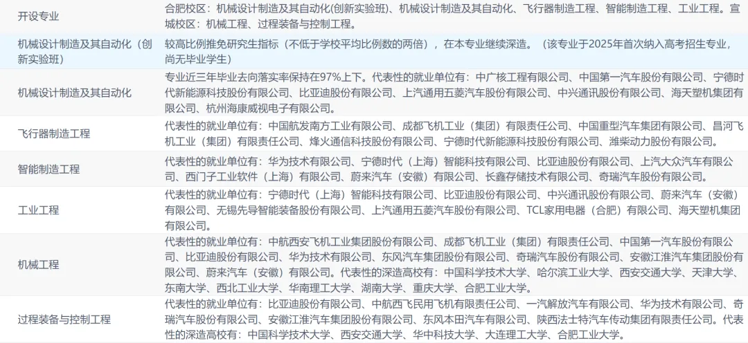 合肥校区:机械设计制造及其自动化(创新实验班)、机械设计制造及其自动化、飞行器制造工程、智能制造工程、工业工程 宣城校区:机械工程、过程装备与控制工程 升学与就业: