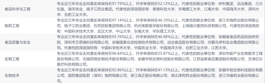 合肥校区:生物工程、生物技术、食品科学与工程、食品质量与安全、制药工程、药学 宣城校区:食品营养与健康、生物技术 升学与就业: