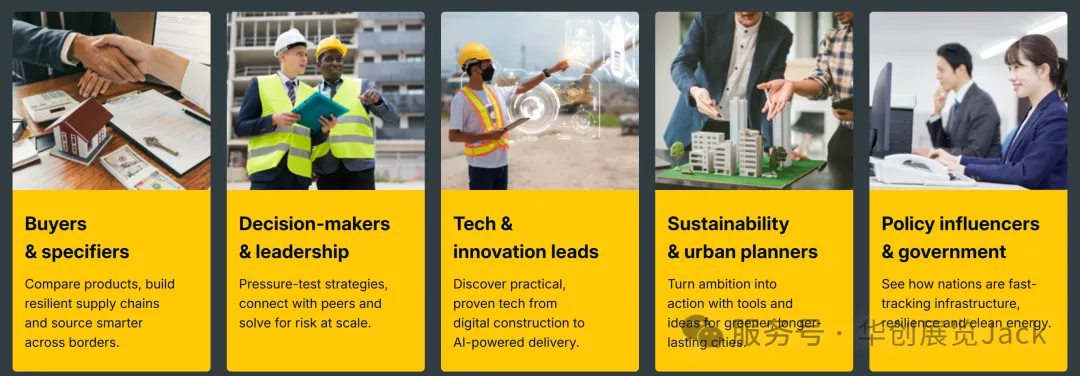 随着我们不断发展,我们的愿景始终聚焦:通过提供一个平台,助力建筑行业在高速增长市场的发展,促进并加速行业的发展。我们激励行业创新,鼓励知识共享,支持生态系统的长期可持续发展,建立社区联系,并成为建筑行业的“必参加”活动。