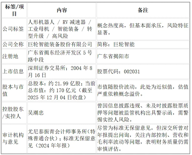 此外,市场关于公司新型XT减速器已进入量产阶段的传闻,尚未得到公司官方的正式公告确认,投资者需警惕概念炒作与信息不对称带来的高风险。这些热闻共同构成了巨轮智能“概念火热、基本面承压、治理风险高企”的复杂局面。