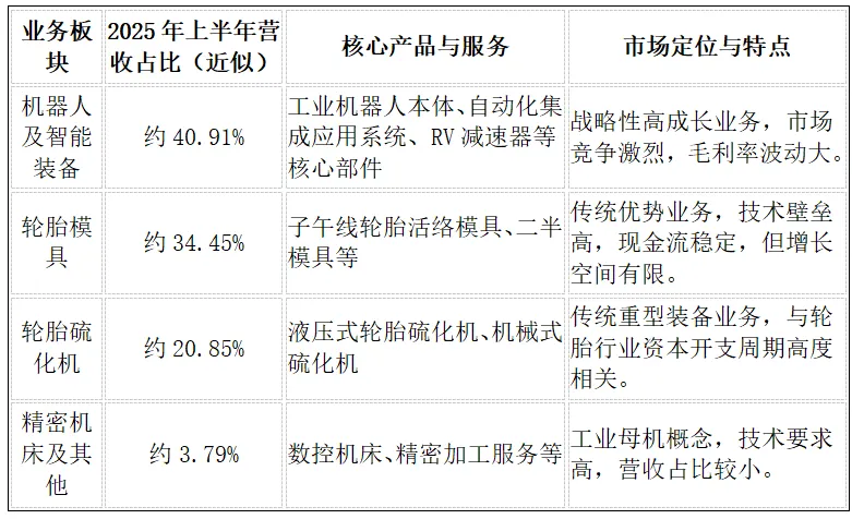 一家从传统轮胎模具制造转型至工业机器人和人形机器人概念的上市公司,虽然紧抓前沿科技热点,但近年来业绩持续低迷,财务压力巨大,且存在控股股东信息披露违规等治理风险,属于高风险、高波动的转型标的,其估值逻辑完全依赖于RV减速器和人形机器人概念的最终兑现。