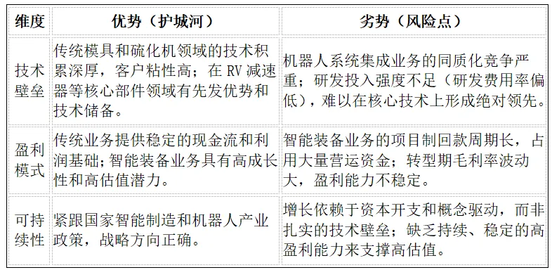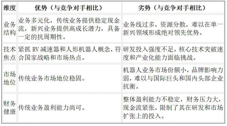 总体而言,巨轮智能的竞争优势在于其传统业务的稳定性和新兴业务的战略方向正确性。然而,其核心劣势在于研发投入的不足和财务健康状况的堪忧,这使得其在智能装备这一资本和技术密集型行业的竞争中,处于相对被动的地位。公司能否成功实现估值重塑,关键在于其能否将“人形机器人”的概念优势,转化为RV减速器等核心部件的规模化、低成本、高质量的量产能力。