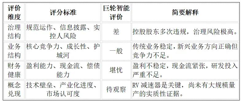 巨轮智能的估值分析是一个典型的“概念估值”与“基本面估值”严重背离的案例。其投资逻辑的核心在于,投资者是否愿意为公司在人形机器人和核心部件领域的“未来”买单,并承担其基本面和治理结构上的“高风险”。