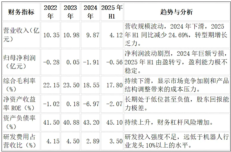 研发费用占营收比长期在3%-4%左右徘徊,2024年更是降至2.89%。对于一家以“智能装备”、“机器人”为核心概念的公司而言,这一投入强度是严重不足的。这不仅远低于行业龙头10%以上的水平,也与其“技术驱动”的战略定位不符。低研发投入意味着公司在技术创新和产品迭代上的后劲不足,难以在核心技术上形成真正的护城河。