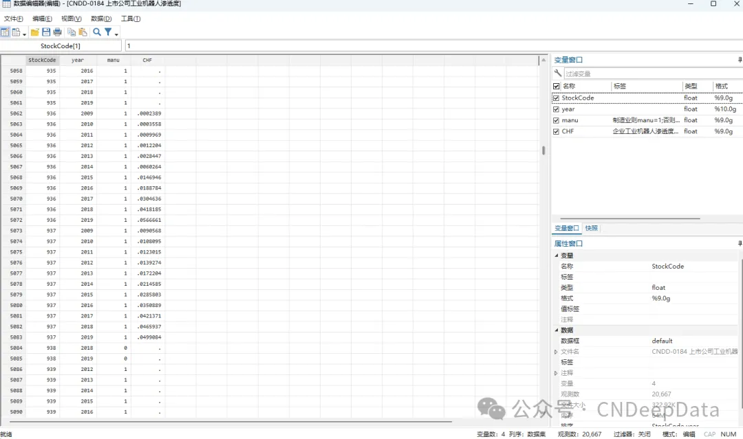▪ 数据说明:CNDD上市公司工业机器人渗透度数据参考盛丹和卜文超(2022)构造企业层面工业机器人渗透度指标,包括股票代码、统计年份和企业工业机器人渗透度指标,数据需要通过stata打开。