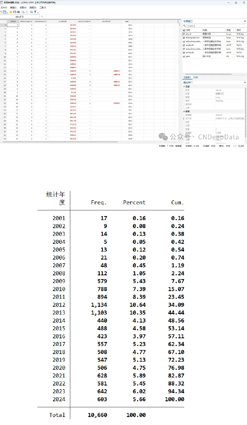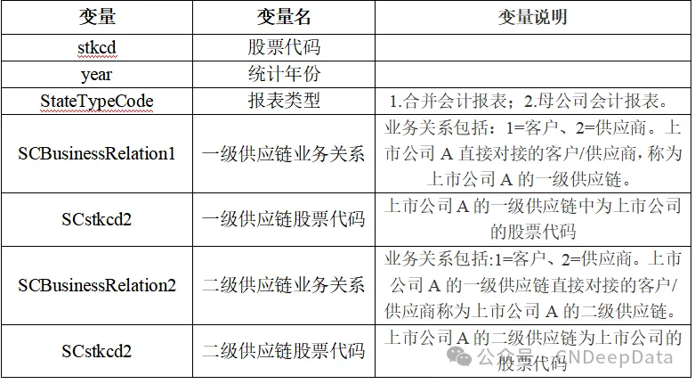 ▪ 数据说明:CNDD上市公司间供应链网络数据收录上市公司与供应链公司网络层级关系指标。包括股票代码、统计年份、报表类型、一级供应链业务关系、一级供应链股票代码、二级供应链业务关系、二级供应链股票代码等变量。提供excel和stata两种打开形式。