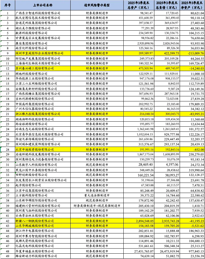 根据各家上市公司的信息披露情况,经过博主的初步检索,发现49家上市公司可能于近期被交易所实施退市风险警示。其中,涉及深交所的上市公司有19家,涉及深交所的上市公司有28家,涉及北交所的上市公司有2家,具体情况如下: