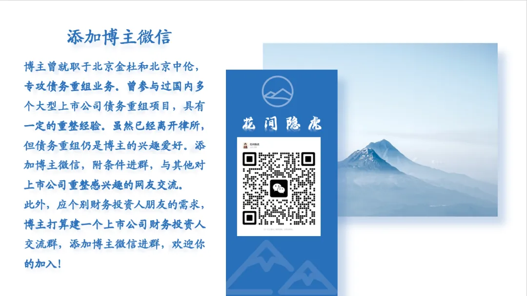 对于广大投资者来说,上市公司重整是一个不错的投资机会,投资方式既可以是债权投资,也可以是股权投资。债权投资一般情况下是通过上市公司(预)重整程序中的共益债务融资参与,或是收购上市公司的债权;股权投资则可以是以重整投资人的身份参与上市公司重整投资,以远低于市场价的价格获得上市公司转增股票,或是在较好的时间节点,通过二级市场买入股票,分享重整成功后的股价上升红利。后续,博主会持续关注上述具有重整价值的上市公司自救情况,并为大家作出分析。